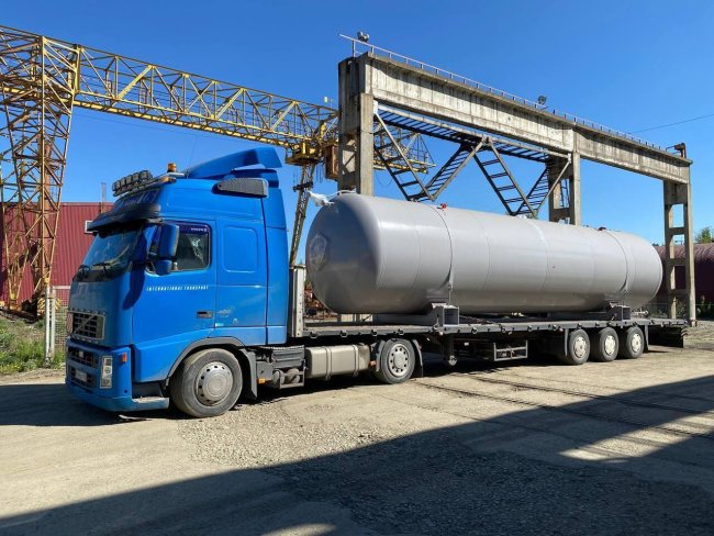 Отгрузка последних двух СУГ-50, объемом 50м3 с территории завода «Гермес-Урал». СУГ-50 представляет собой цилиндрический сосуд, изготовленный из стали 09Г2С с соблюдением всех требований ГОСТ 34347-2017. Предназначен для приема, хранения, выдачи жидких и газообразных продуктов. Резервуар снабжен технологическими штуцерами для установки приборов КИП и люком. Рабочее давление сосуда составляет 1,6 МПа. Габаритные размеры емкости: длина 11420…